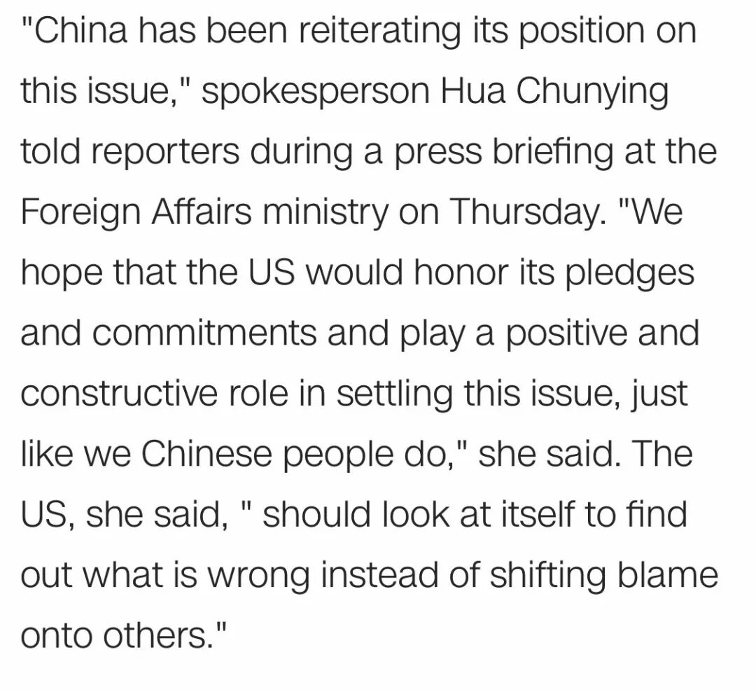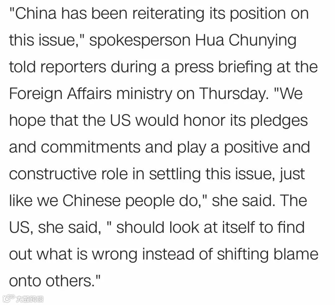 CNN援引华春莹记者会上的发言称,人家中方已经声:对不起,这个“甩锅”,不接!