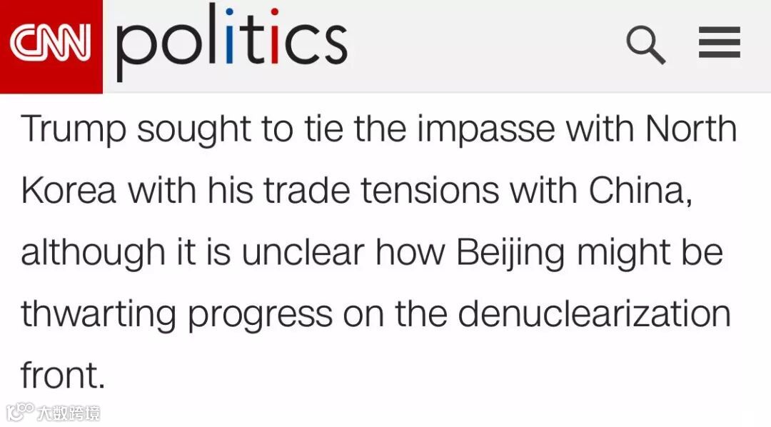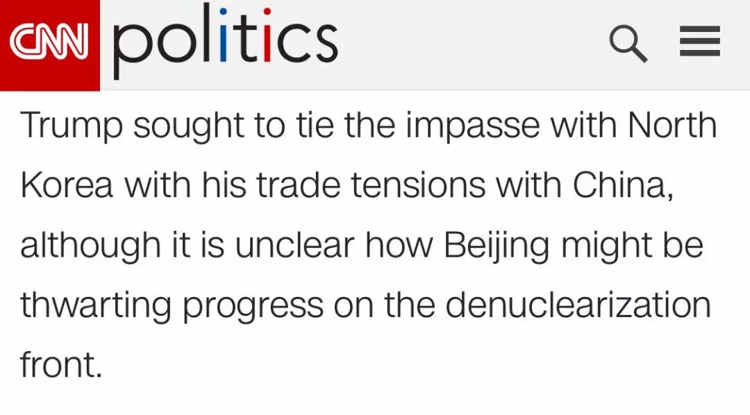 CNN(美国有线电视新闻网)报道称,特朗普力图把美朝僵局强推到与他贸易紧张的中国身上,尽管根本说不出中国怎么阻碍无核化进程。