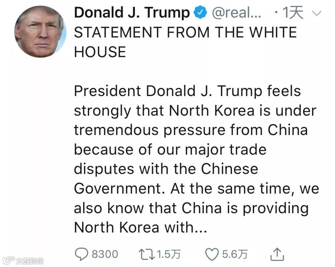 “唐纳德·特朗普总统强烈认为,因美中发生重大贸易争端,朝鲜面临来自中国的巨大压力。同时,众所周知,中国向朝鲜提供了......”