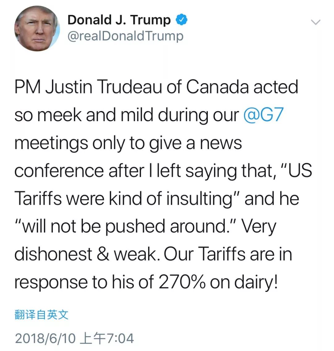 在G7峰会上,加拿大总理特鲁多表现得如此温顺和温和,却在我离开后,召开新闻发布会说,“美国的关税有些侮辱人”,他“不会任人摆布”。他实在是非常不诚实还很怂。我们的关税实际上是对他在乳制品上的征收270%关税的回应。
