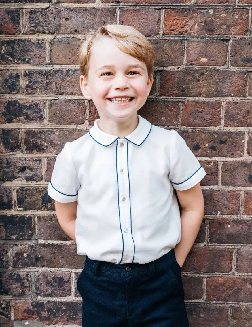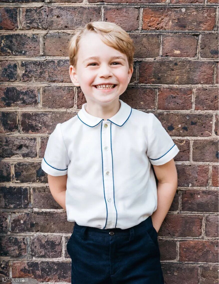 今年的照片中,小王子身穿白色衬衫和深蓝色短裤,背着手站在克拉伦斯宫花园的墙边,眼睛弯弯的,满脸灿烂笑容,甚是活泼可爱。