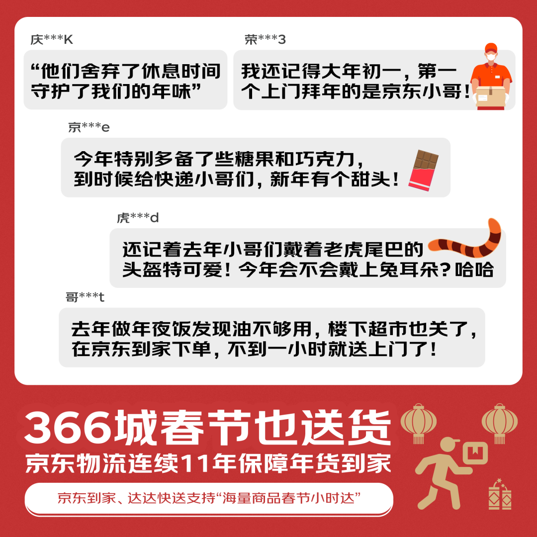 “还记得,去年春节第一个上门拜年的,是京东小哥!除夕下的单,初一一早就送上门了!小哥的头盔上还带着老虎尾巴,妥妥的气氛组!今年春节还要下单,看看兔年限定款头盔什么样!”回忆起2022年春节期间的小趣事,上海的王女士说,“今年特意多备了一些糖果和巧克力,打算送给小哥,感谢他们的坚守,让他们也多一些甜头”。