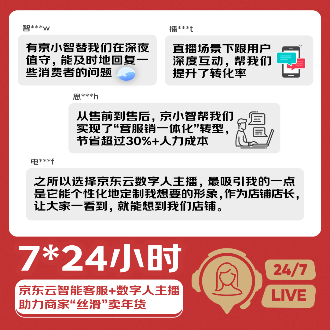 此外,基于京东云自研AI技术推出的第三方商家客服——京小智,在年货节期间将为京东超17.8万商家提供涵盖售前、售中、售后的全流程交互式对话体验,可为商家节省30%+人力成本,推动商家实现营服销一体化转型。
