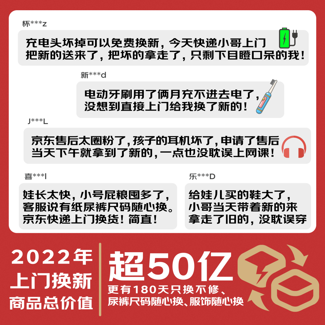 “上门换新”是京东在2007年率先在行业内首创推出的服务,依托物流供应链优势,以及“运费险”“上门取件”“上门换新”三重产品保障,快递小哥最快3个小时可以把换新的商品送上门,同时取走旧商品,为用户节省商品返回、商品检测、商品发货等多个环节的等待时间。基于“上门换新”,京东还听取用户需求建议,陆续推出了服饰鞋靴随心换、尿裤90天尺码随心换、180天只换不修等特色服务,深受青睐与好评。2022年,京东上门换新的商品总价值超50亿。