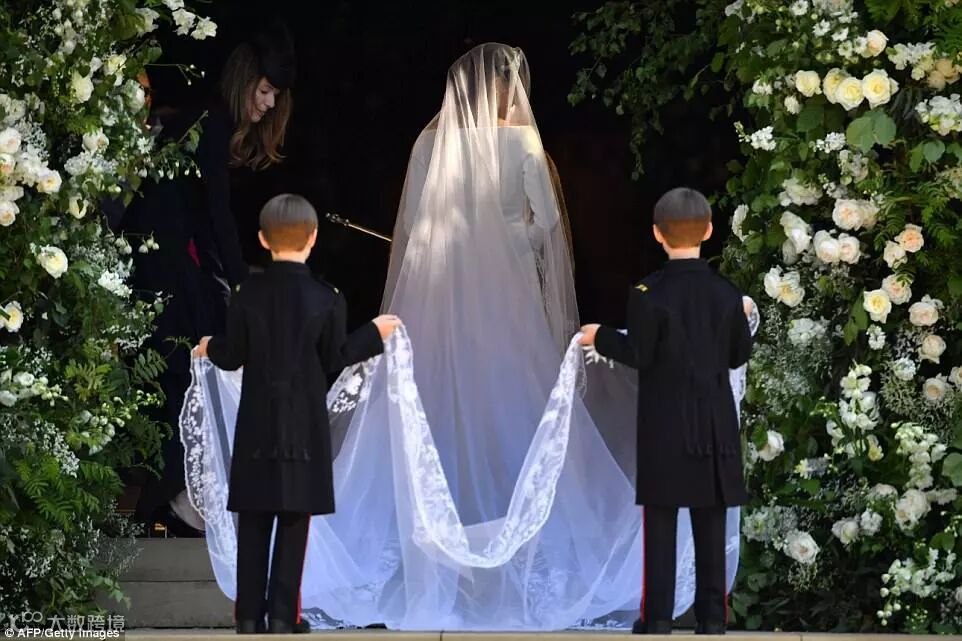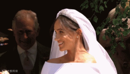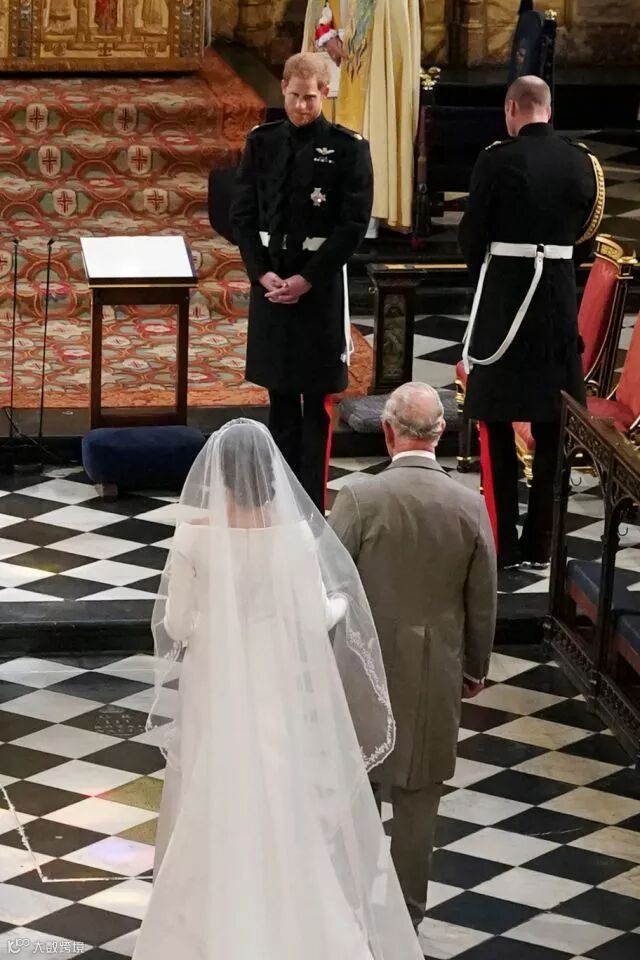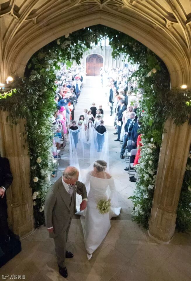 陪伴梅根走入教堂的人选可谓是一波三折。由于梅根父亲最终的缺席,在婚礼的前一日,官方才宣布将由查尔斯(哈里王子的父亲)担任这一角色。