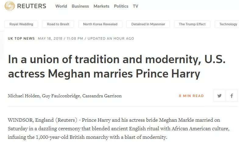 路透社:《传统与现代的结合,美国女演员梅根嫁与哈里王子》