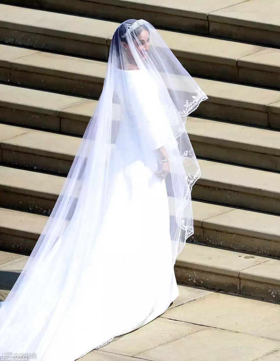 梅根的婚纱由纪梵希创意总监Clare Waight Keller亲自设计。梅根的面纱由丝绸薄纱制成。由于哈里王子是英联邦青年大使,所以面纱绣上了53个英联邦国家植物组合成的精美花卉。