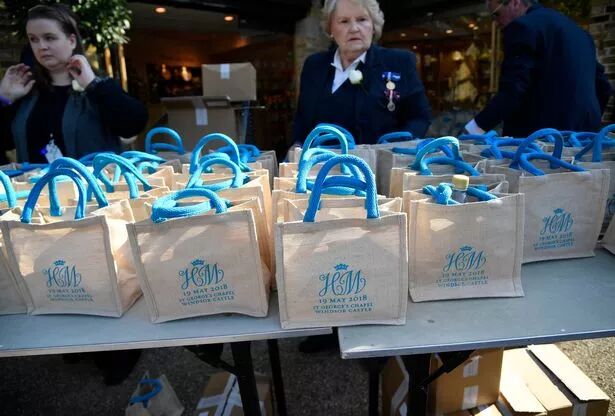 Commemorative gift bags are being handed out to the lucky members of public who are celebrating the wedding of Prince Harry and Meghan Markle from inside the grounds of Windsor Castle. They contain a box of shortbread cookies, a giant chocolate coin, a bottle of water and a magnet.