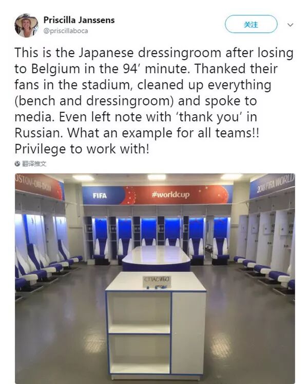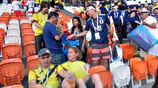 日本队在输球后把更衣室打扫得一尘不染,球迷在比赛结束后在看台捡垃圾,这些行为引来全球媒体和网友的点赞。