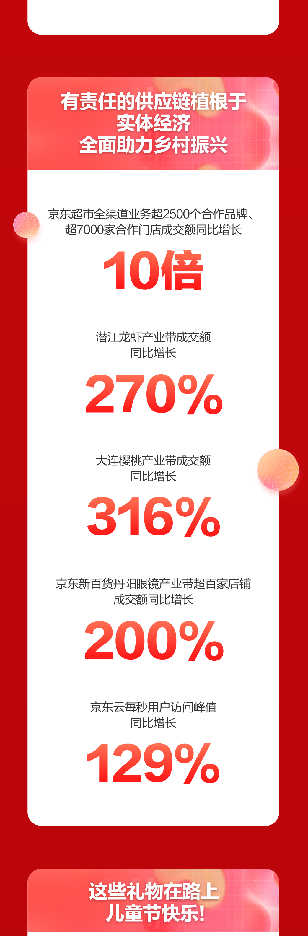 此外,京东超市全渠道业务超2500个合作品牌、超7000家合作门店成交额同比增长10倍,企业业务成交额同比增长超2倍,超40家商超、电商类平台供应链合作成交额同比增长超8倍。