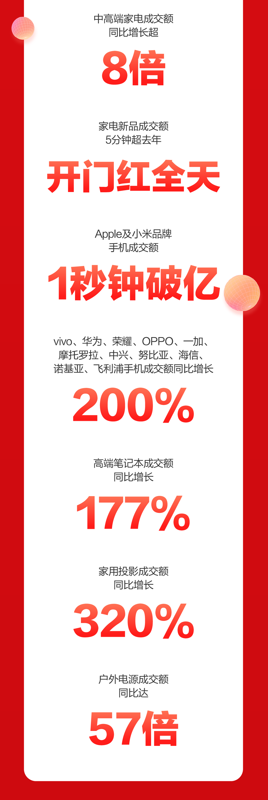 家电产品中,中高端家电成交额同比增长超8倍,开门红10分钟家电预售付尾款成交额同比增长超3倍;此外,家电新品、趋势家电备受用户青睐,家电新品5分钟成交额超去年全天;新风空调、游戏电视、变频静音烟灶套装、空气炸锅10分钟成交额超去年全天;冰洗套装、自清洁扫地机人10分钟成交额超去年同期全月;射频美容仪10分钟成交额同比增长超10倍;加热净水器10分钟成交额同比增长超4倍。