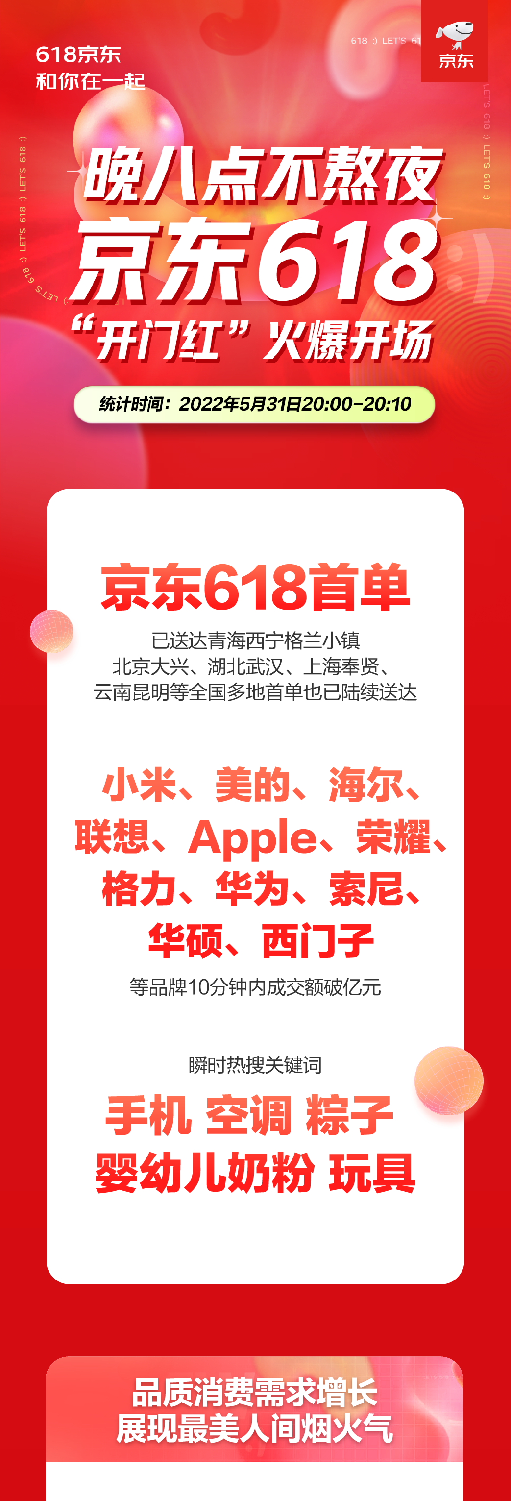 晚8点刚过,海量消费者即涌入京东618主会场。开场10分钟内,小米、美的、海尔、联想、Apple、荣耀、格力、华为、索尼、华硕、西门子等品牌成交额破亿元,“手机、空调、粽子、婴幼儿奶粉、玩具”成为热搜关键词,展现出中国消费市场坚定的韧性和深厚的潜力。