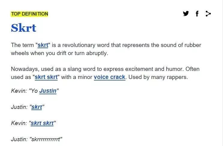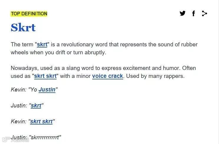 skr一词的全拼是skrt,根据美国俚语词典(Urban Dictionary)中的解释:指汽车轮胎突然转向(turn abruptly)的声音。