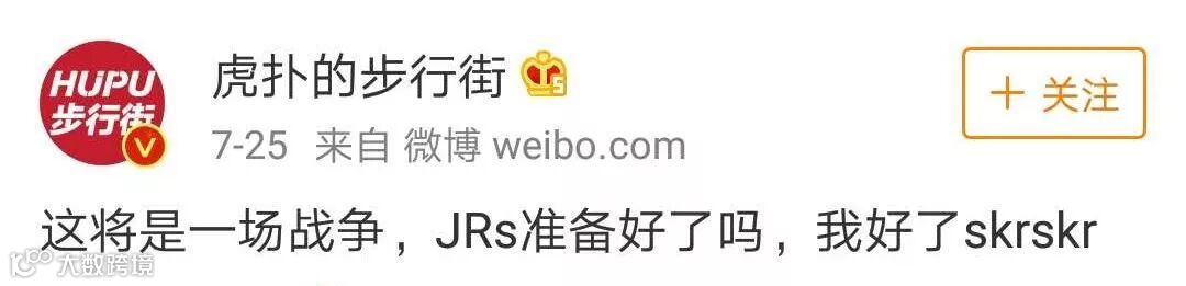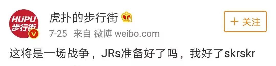 虎扑官方微博也加入其中,发微博应援,指出JRs已准备好迎战skrskr。