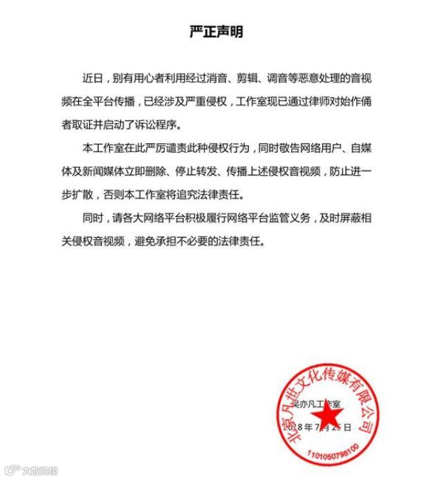 吴亦凡经纪公司对此事也作出了严正声明,强调恶意传播处理过的视频严重侵权,要求相关方立即删除,否则追究法律责任。