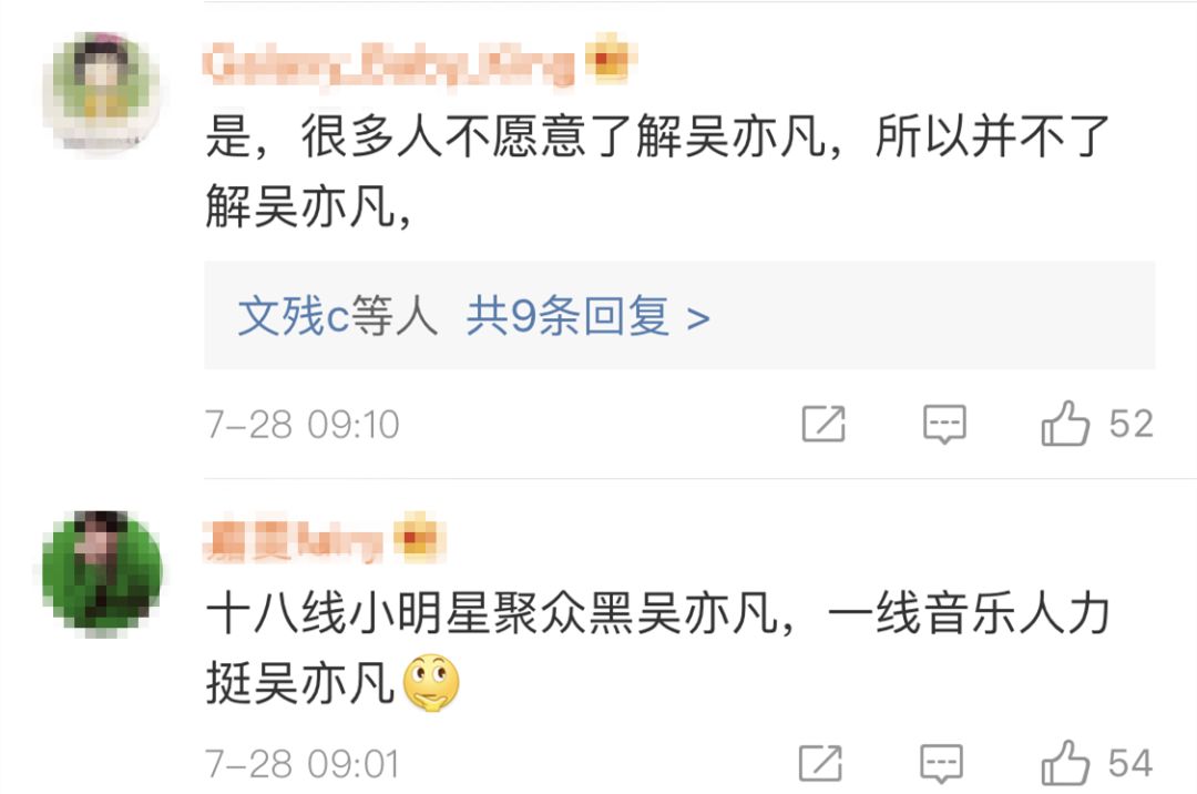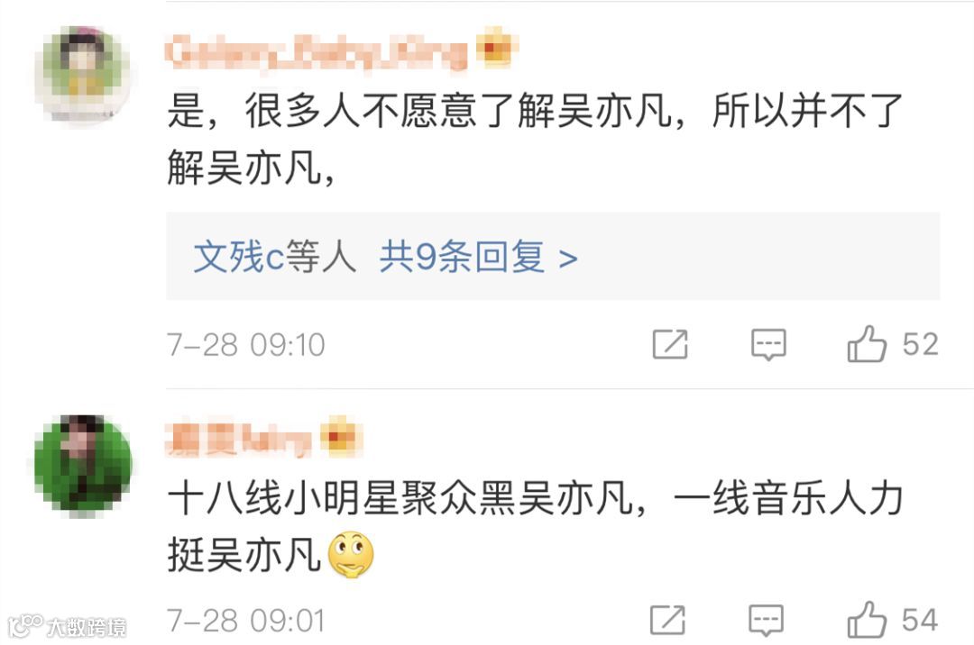 吴亦凡粉丝表示该视频被恶意修改,不是吴亦凡原声,在虎扑上对诋毁吴亦凡的帖子进行踩和举报,并在微博等社交媒体发声,表达对吴的支持。