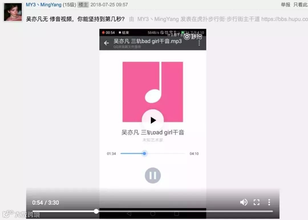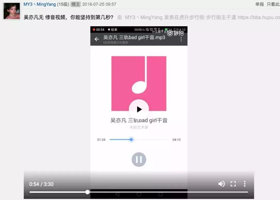 7月25日,一名网友在虎扑(注:一个篮球爱好者聚集地)步行街上发表了名为《吴亦凡无修音视频,你能坚持到几秒?》的帖子,贴子中附有据说是吴亦凡唱歌的无修音视频(unedited video)。