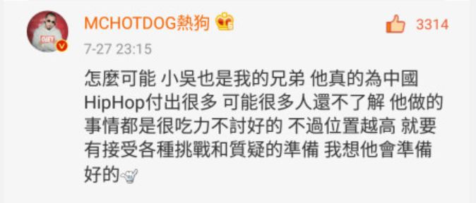 同为《中国新说唱》制作人的热狗表达了对吴亦凡的支持,称他为中国Hip-Hop做了很多吃力不讨好的事。
