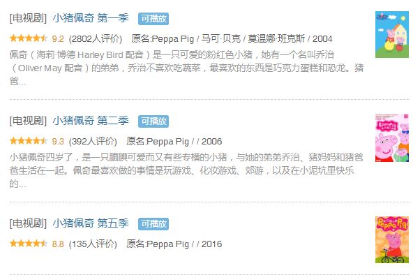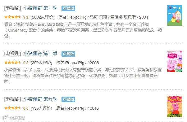 短视频平台抖音上#小猪佩奇#话题下的视频超过3万个。该系列动画在评论网站豆瓣上获得9.2分的高分。去年10月播出的第五季在视频平台优酷上的点击量超过140亿。小猪佩奇主题公园定于2019年在北京和上海开放,而明年刚好是猪年。