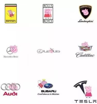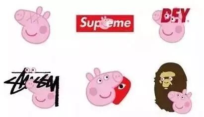今年3月,有网友发布了一系列图片,将小猪佩奇表情与高端品牌的标志合成在一起。