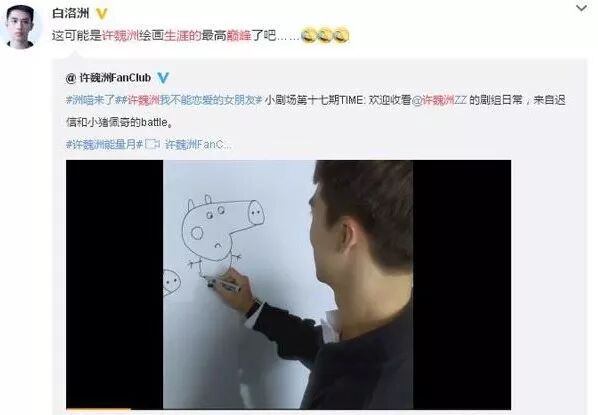 演员许魏洲的小猪佩奇白板画本周在微博上引起轰动,粉丝调侃这幅简笔画可能是他艺术生涯的巅峰。