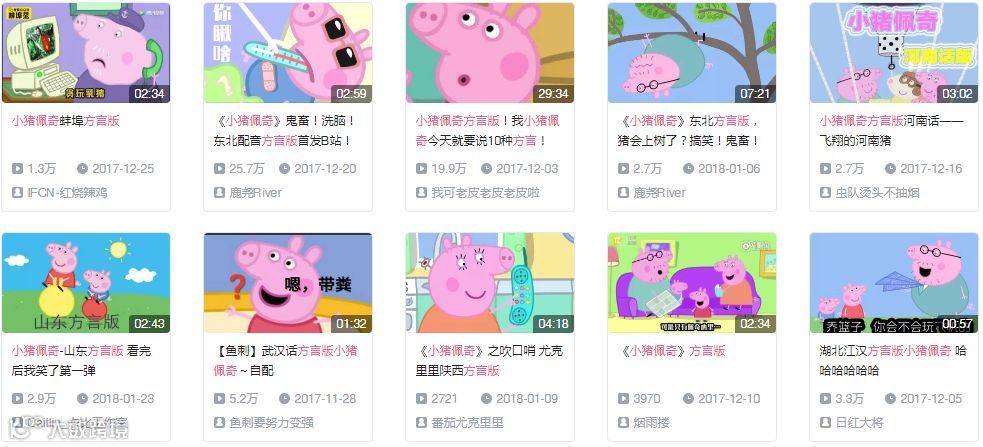 随后,《小猪佩奇》方言版恶搞视频占领了B站鬼畜区,多个视频播放量超过百万。