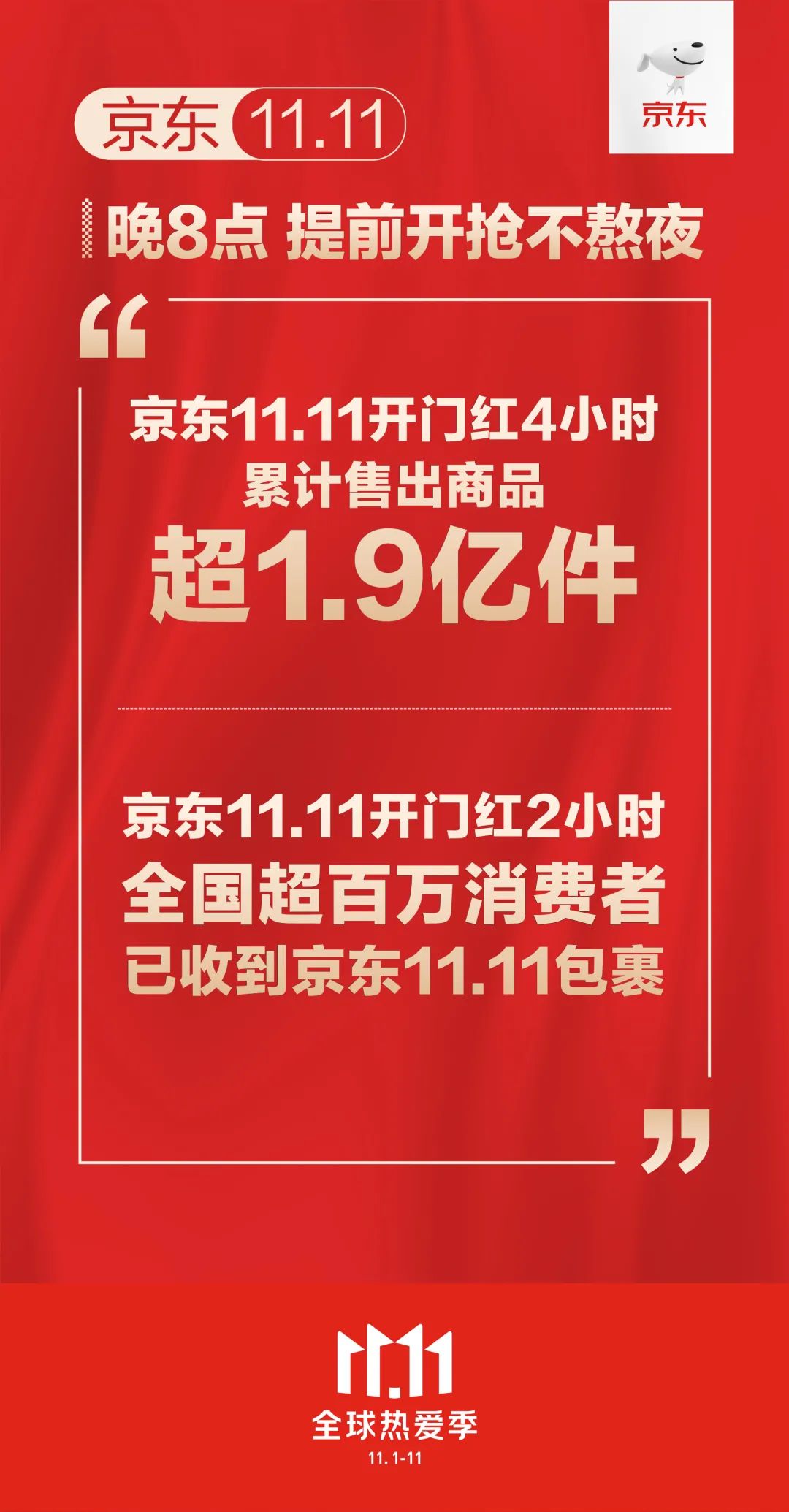 2021年京东11.11全球热爱季正式开启,从10月31日晚8点开始的4个小时内,京东累计售出商品超1.9亿件;而截至31日22点的两小时内,全国超百万消费者已经收到京东11.11包裹。