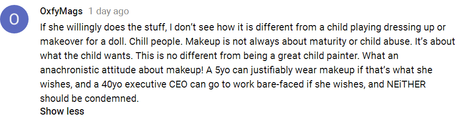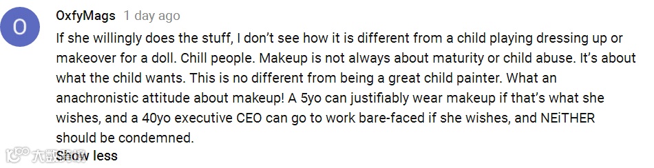 如果她喜欢做这件事,那我觉得这和一个孩子给自己娃娃化妆或者穿衣服没什么区别。真是令人心寒的人们。不是一提起化妆,就是成熟或者是儿童虐待。孩子真正想要的才是重要的。这就和成为一个儿童画家没有任何区别。人们关于化妆的态度已经过时了!无论是一个5岁的孩子想要化妆还是一个40岁的CEO想在工作的时候素面朝天,都无可厚非,只要她们愿意。