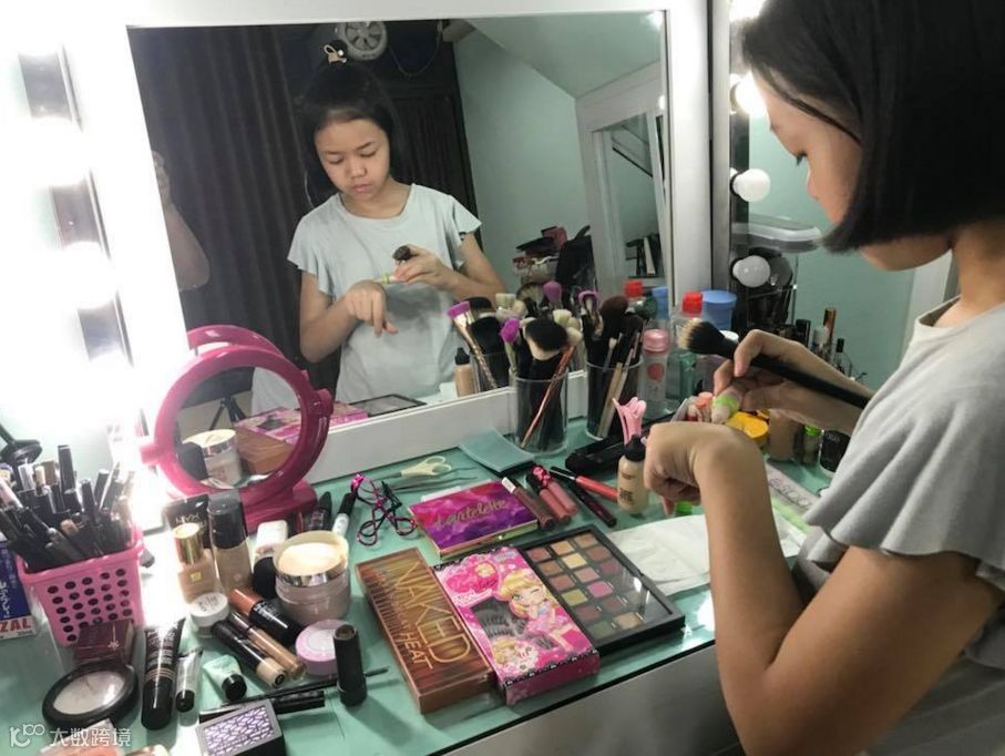 我自己不怎么化妆。过去我经常把它们藏在她够不着的地方。她每时每刻都在学习化妆,并且很努力地想要提高自己。我想这可能是她真正的激情所在。