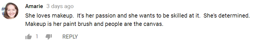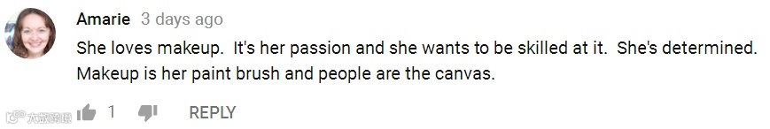 她喜欢化妆。这是她的兴趣所在,她希望能够做好。她非常坚决。化妆就是她的画笔,而人们则是她的画布。