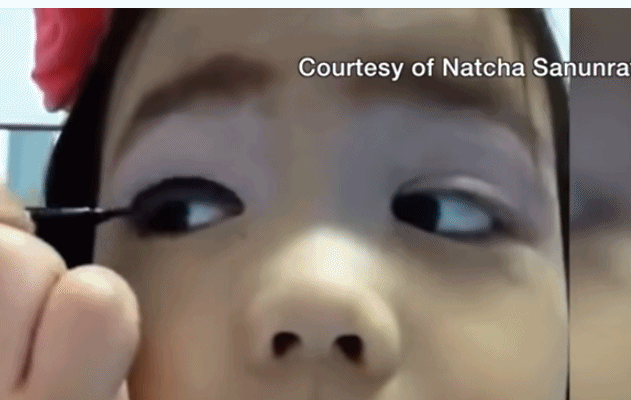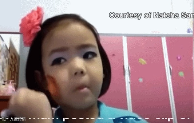 据说,三岁时Natthanan开始就对化妆产生了浓厚的兴趣,口红、散粉用得都是十分地娴熟啊……可是毕竟还是嫩了点,这个眼线有点别具一格呀。