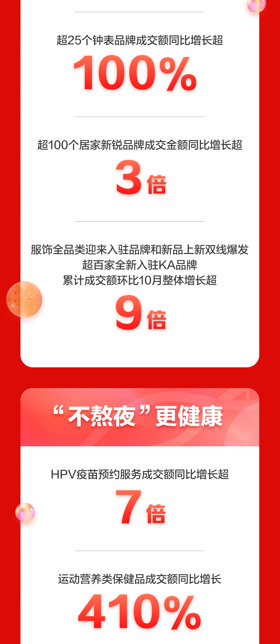 食品消费也呈现高品质趋势,全麦面包成交额同比增长316%,食品老字号成交额同比增长206%;酒类消费中,高端单一麦芽威士忌成交额同比增长6倍;家庭清洁用品中,洗衣凝珠成交额同比增长150%;生鲜品类中,低温奶成交额同比增长265%,大闸蟹成交额同比增长260%,可生食鸡蛋销量同比增长136%。