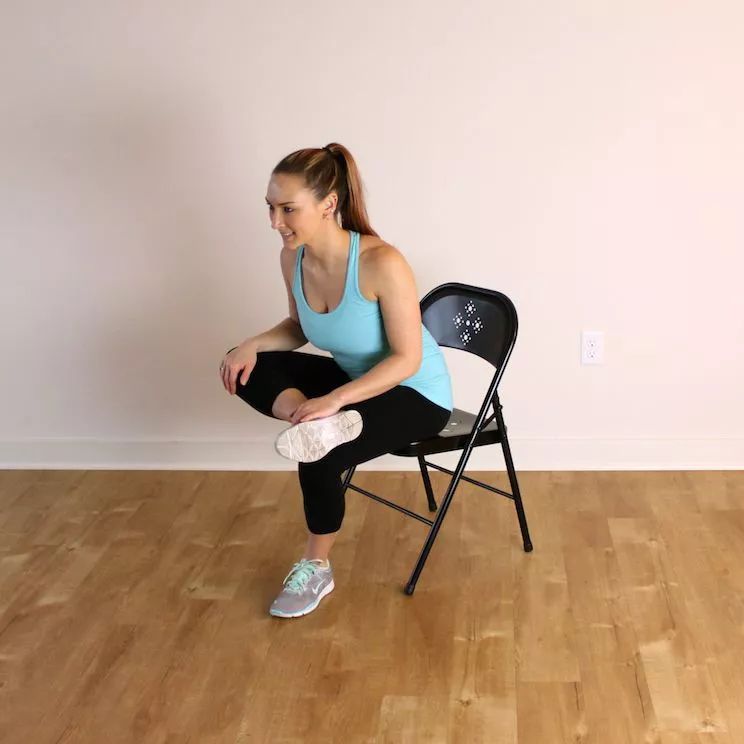 站在办公桌前面,抬起左腿,左脚跟朝臀部抬。