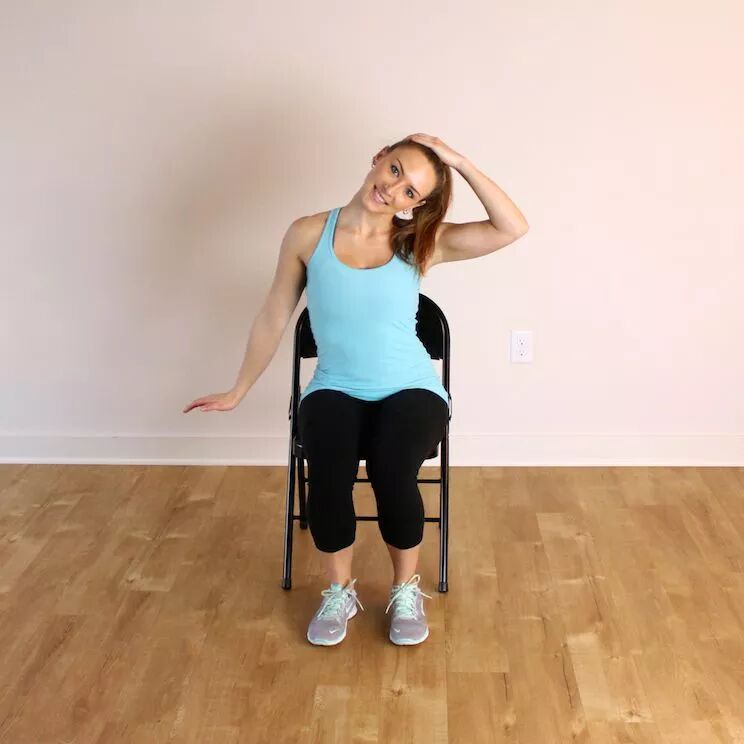 右耳贴向右肩膀,用右手轻轻地把头朝右耳方向推去,左手弯曲,朝向地面方向。坚持30秒然后换另一侧。