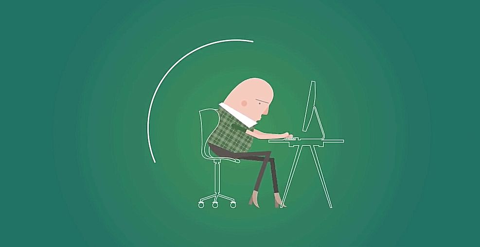 你埋头苦干的身影是这样的,背部弯曲,肩部下垂,而这会压迫脊柱: