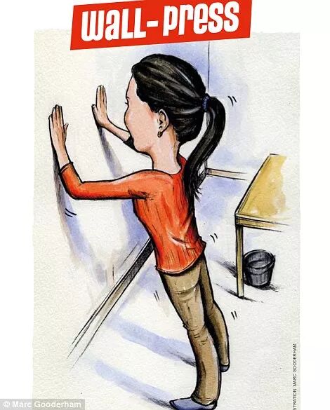 向后迈一步,利用腹部力量,向下压直到离墙面几厘米,然后往回推。