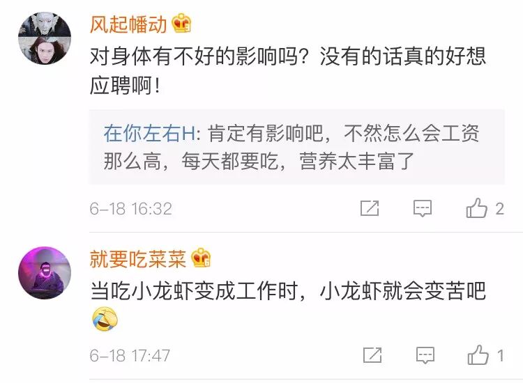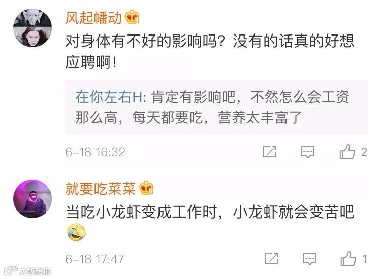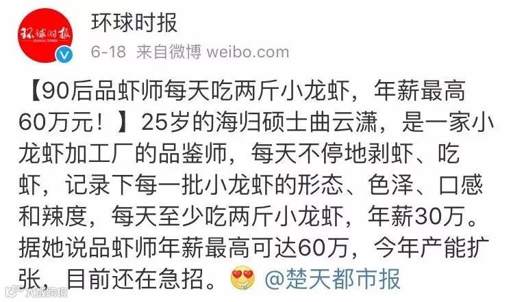 最近,有一条微博消息特别吸引人眼球:90后“品虾师”年薪30万。