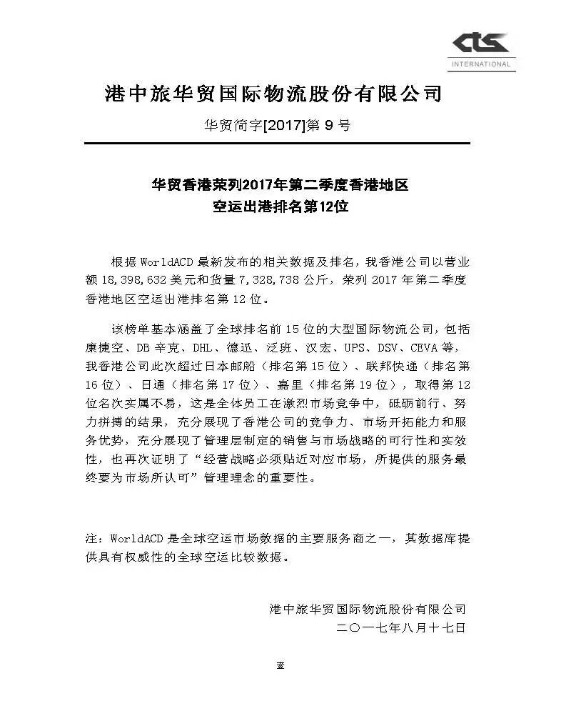 港中旅华贸香港公司荣列2017年第二季度 香港地区空运出港排名第12位