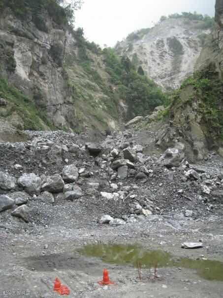 几个小时里我们都没有看到其他的事物,只有一些从山顶滑落的岩石和砂砾。建筑物也全部坍塌,只剩下顶端在这片废墟景象里,孤零零的像海面上的潜望镜。还有其他一些建筑物的底部楼层,通过山崖间的瀑布,出现在我们的视野中。