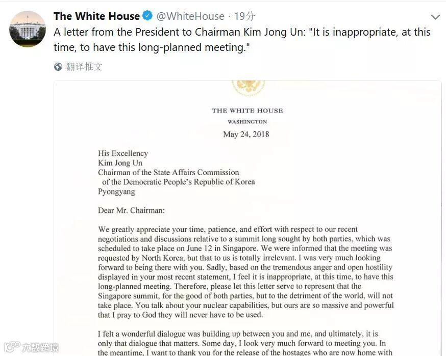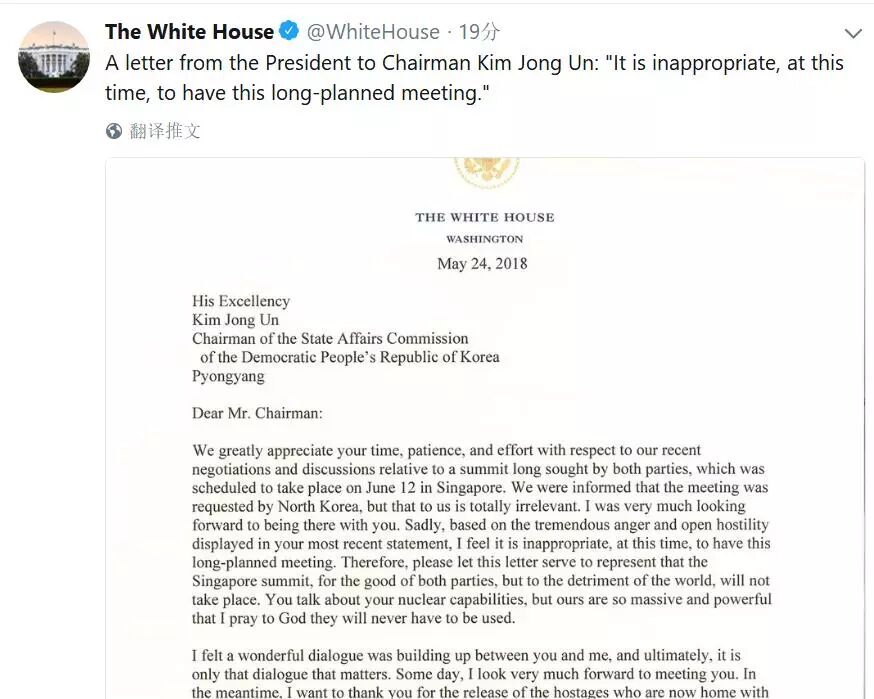 ➤ 白宫当天早上发布了一封特朗普致金正恩的公开信。特朗普在信中说,他十分期待与金正恩在新加坡会晤(he was very much looking forward to being in Singapore with Kim),但朝方在近日展现出"极大怒气与公开敌意(tremendous anger and open hostility)",他认为当前已不适合举行这次计划已久的会晤(it was inappropriate, at this time, to have this long-planned meeting)。特朗普还说,他认为朝方此次"错失良机",但仍非常期待未来能与金正恩会面。他感到自己与金正恩已建立起良好的对话(a wonderful dialogue was building up between Kim and him),而最终真正起作用的仍将是对话(it is only that dialogue that matters)。