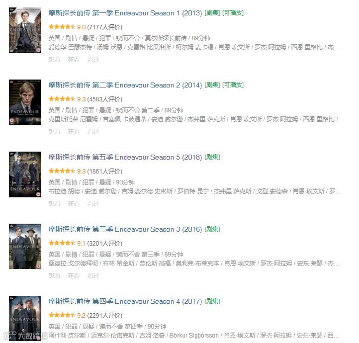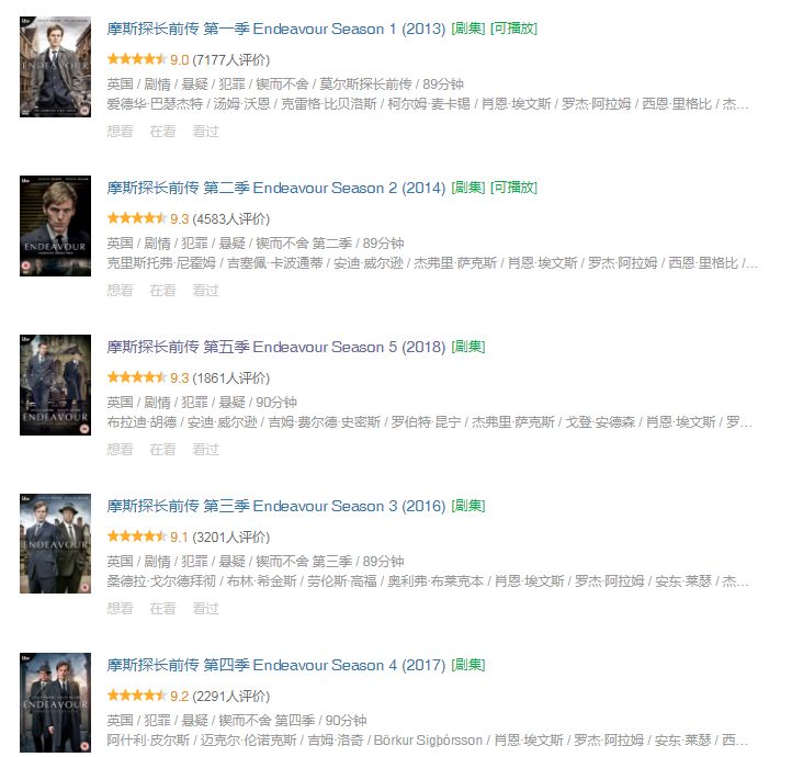 《摩斯探长前传》每季的豆瓣评分均在9分左右,好评如潮。