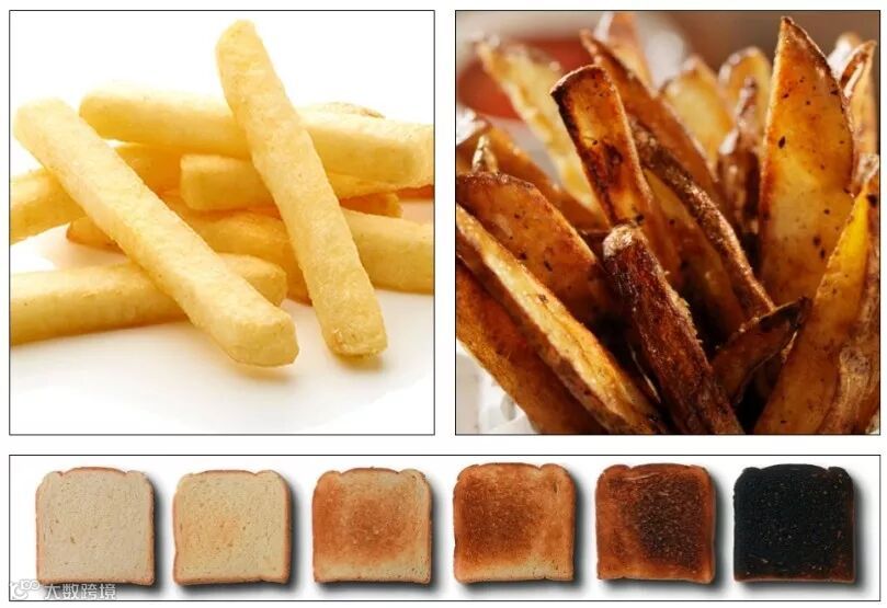 淀粉类食物在高温下长时间被烘烤、烧烤、煎炸时,就会产生丙烯酰胺。