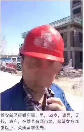 这个段子的中文是这么说的:雄安新区征婚启事,男,53岁,离异,无孩,农户,在雄县有两亩地,希望女方25岁以下,英美留学优先。