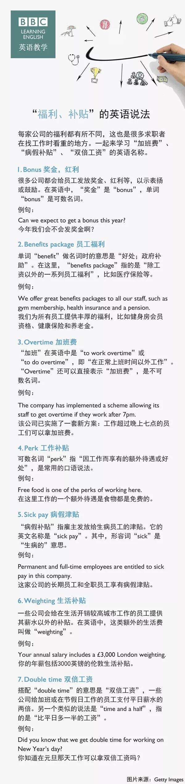 每家公司的福利都有所不同,这也是很多求职者在找工作时看重的地方。一起来学习“加班费”、“病假补贴”、“双倍工资”的英语名称。