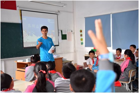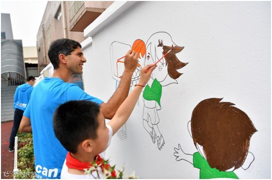 志愿者还带领孩子们一起,让学校操场的围墙来了个“大变身”。在他们的画笔下,游泳、足球、羽毛球、篮球、排球、跳高等场景的卡通画(cartoon)五颜六色、生动有趣,成为学校一道亮丽的风景线。