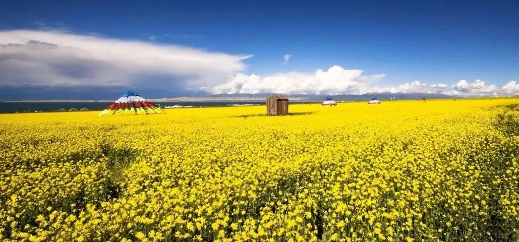 油菜花的花期一般从6月持续到10月,在变化莫测的天空和神圣的蓝色湖水的映衬下,油菜花的金黄色显得尤为耀眼。