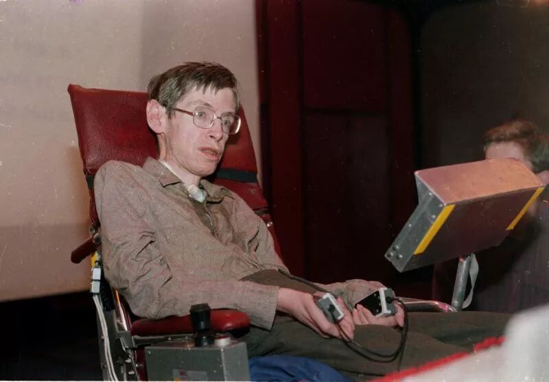 这种病使得霍金瘫痪在轮椅上。他全身能动的部位只有一只手的几根手指,几乎所有的事情——洗澡、穿衣、吃饭,甚至说话——他都要完全依赖他人,或工具的帮助。