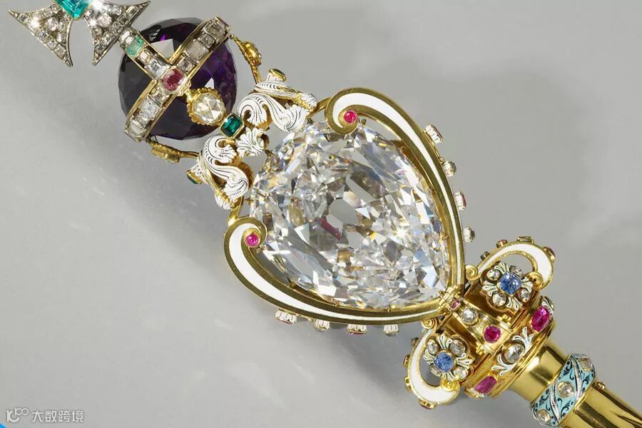 英女王伊丽莎白二世继承的“库里南第一”是一枚梨形刻面钻,镶嵌在英国君主十字权杖上端。这颗钻石重达530.4 克拉(106.04克),长达5.89厘米,宽达4.54厘米,深2.77 厘米。