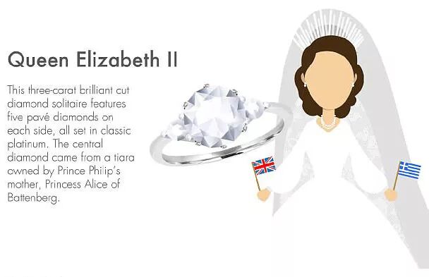 英国女王的订婚戒指也是一枚三钻戒,但中间最大的钻石只是一颗3克拉的钻石。整枚戒指现在估价大约为10万英镑。这枚戒指不仅看起来不那么耀眼,而且在伊丽莎白二世的珠宝收藏里真的不算什么。