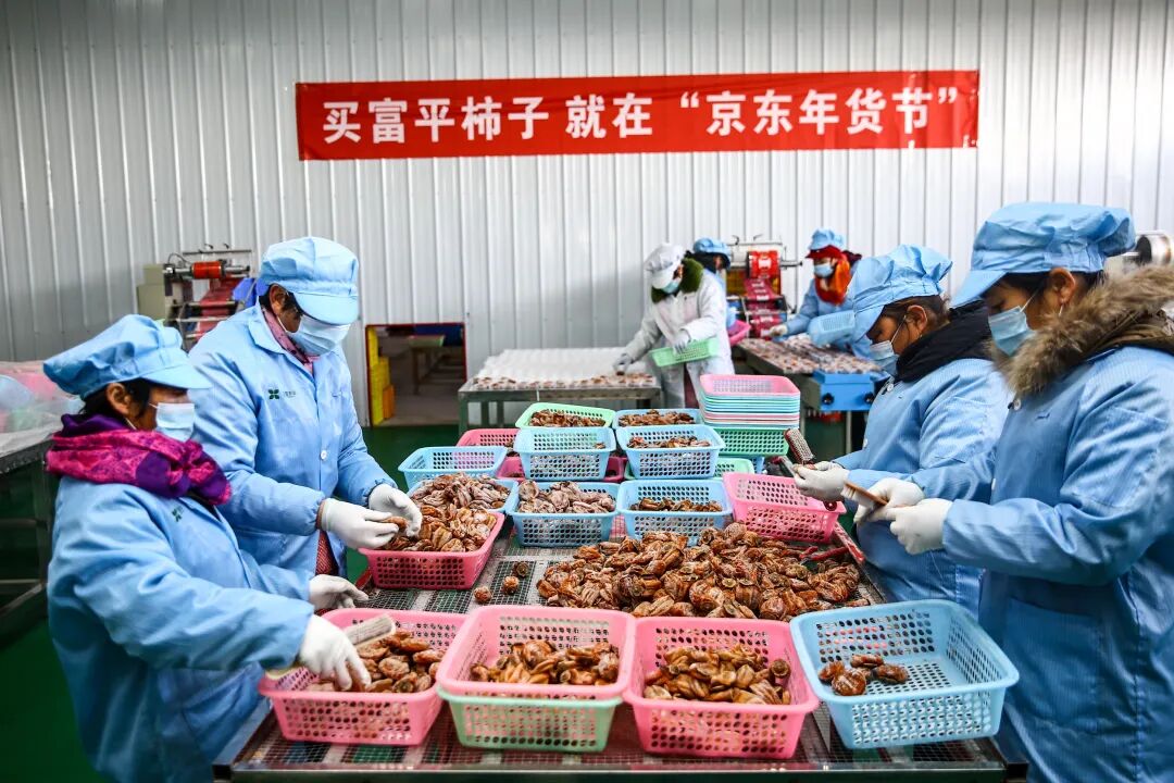 在加工车间里一个个颜色红润鲜亮的柿饼正在等待被分拣,工人正热火朝天的忙碌着。目前富平县在携手京东积极打造“年货村”,让越来越多的消费者认识富平柿子,借助筹备年货的时机,让富平柿饼走进更多家庭的“年味”中。